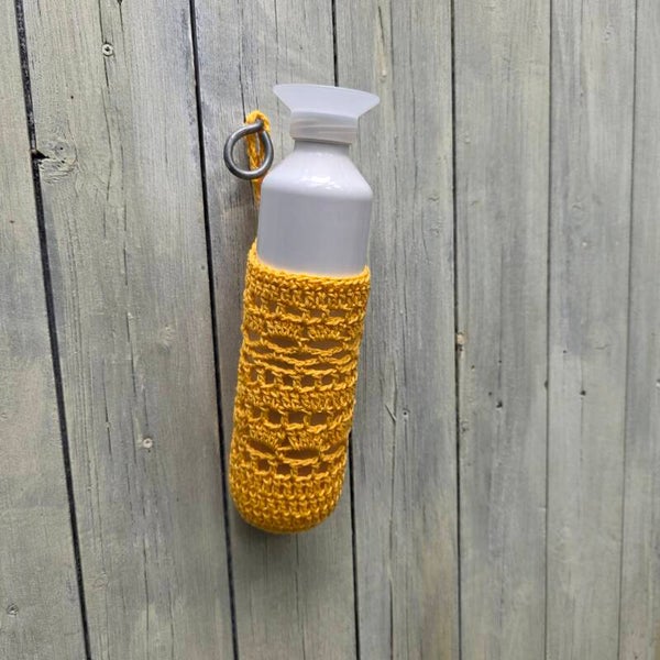 Gehaakt tasje om je waterfles makkelijk mee tenemen. Super handig als je gaat wandelen, shoppen of op een festival.